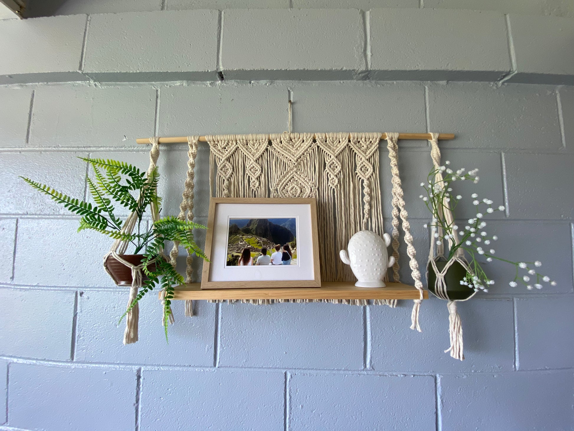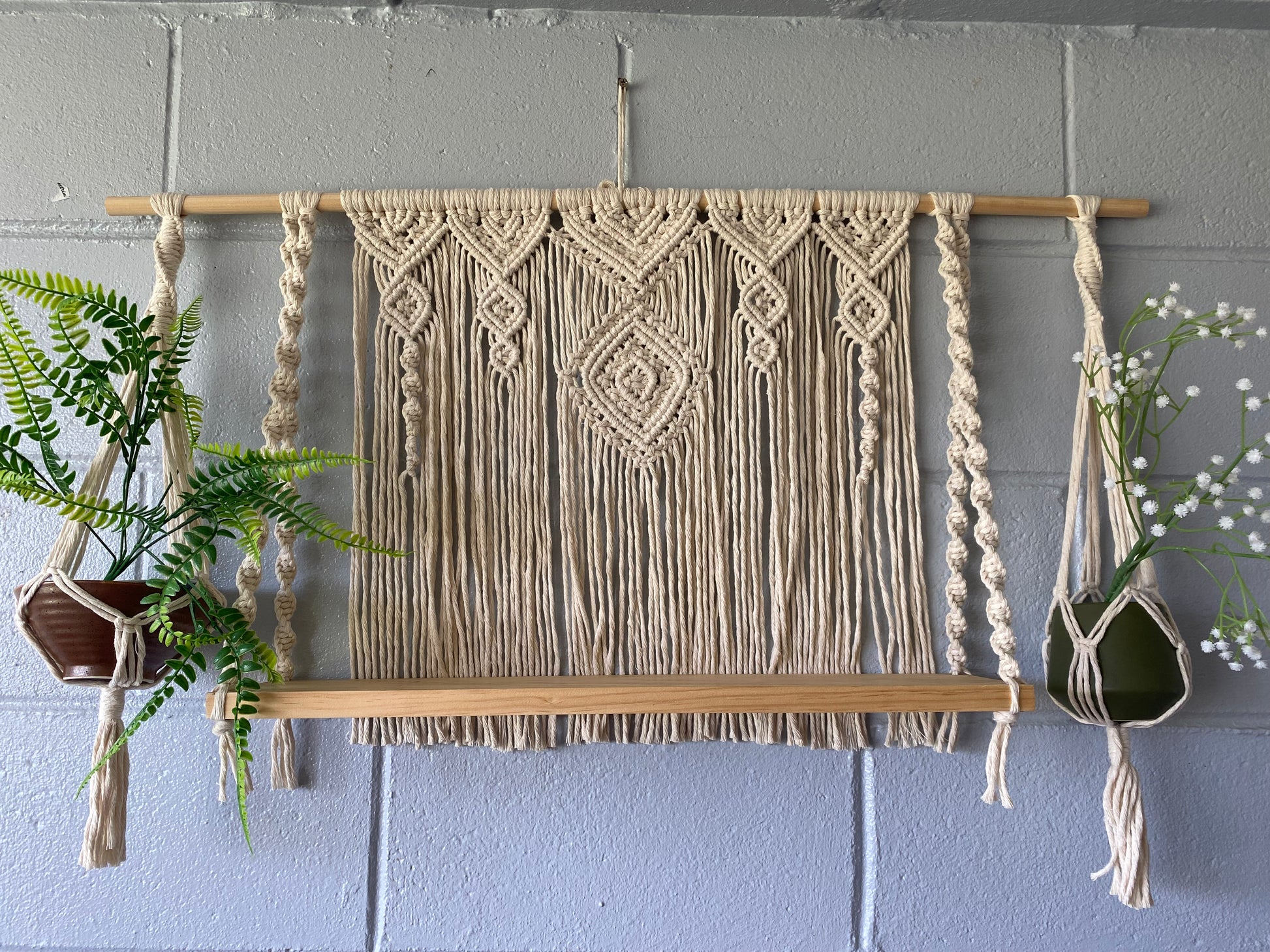Elevate your space with this handcrafted macrame shelf—a stylish blend of boho charm and practical storage, perfect for displaying plants, books, or treasures.